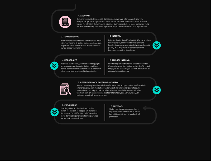 Efter traineeprogrammet går du direkt vidare till en roll som konsult. Du kan antingen gå ut i kunduppdrag tidigt, redan under programmet, eller börja i vårt labb med interna projekt. I början kan tillgången på uppdrag variera och under den tiden fokuserar vi på att bygga din kompetens och göra dig redo för ditt kommande uppdrag.